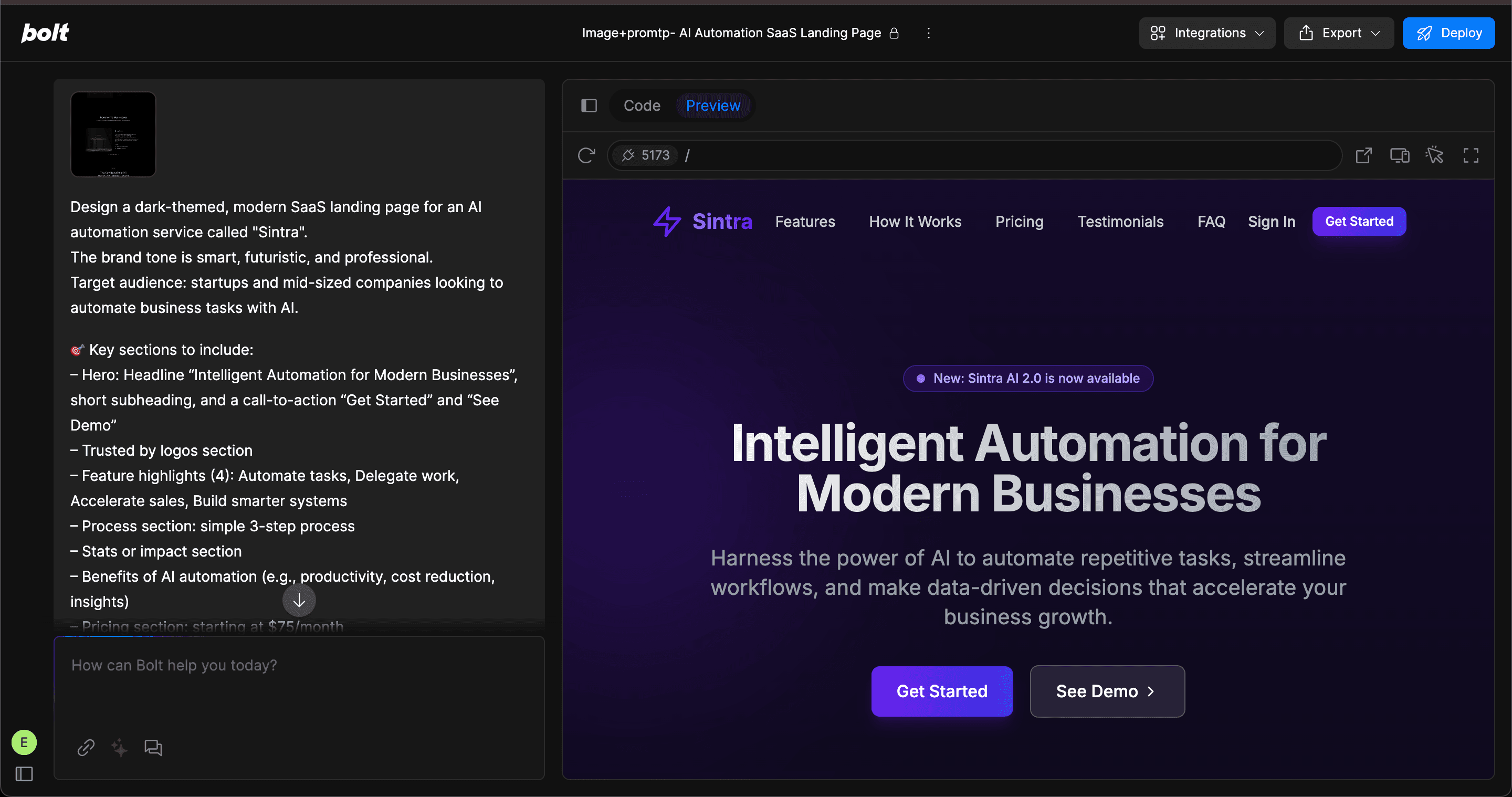 “Design a dark-themed, modern SaaS landing page for an AI automation service called ‘Sintra’.