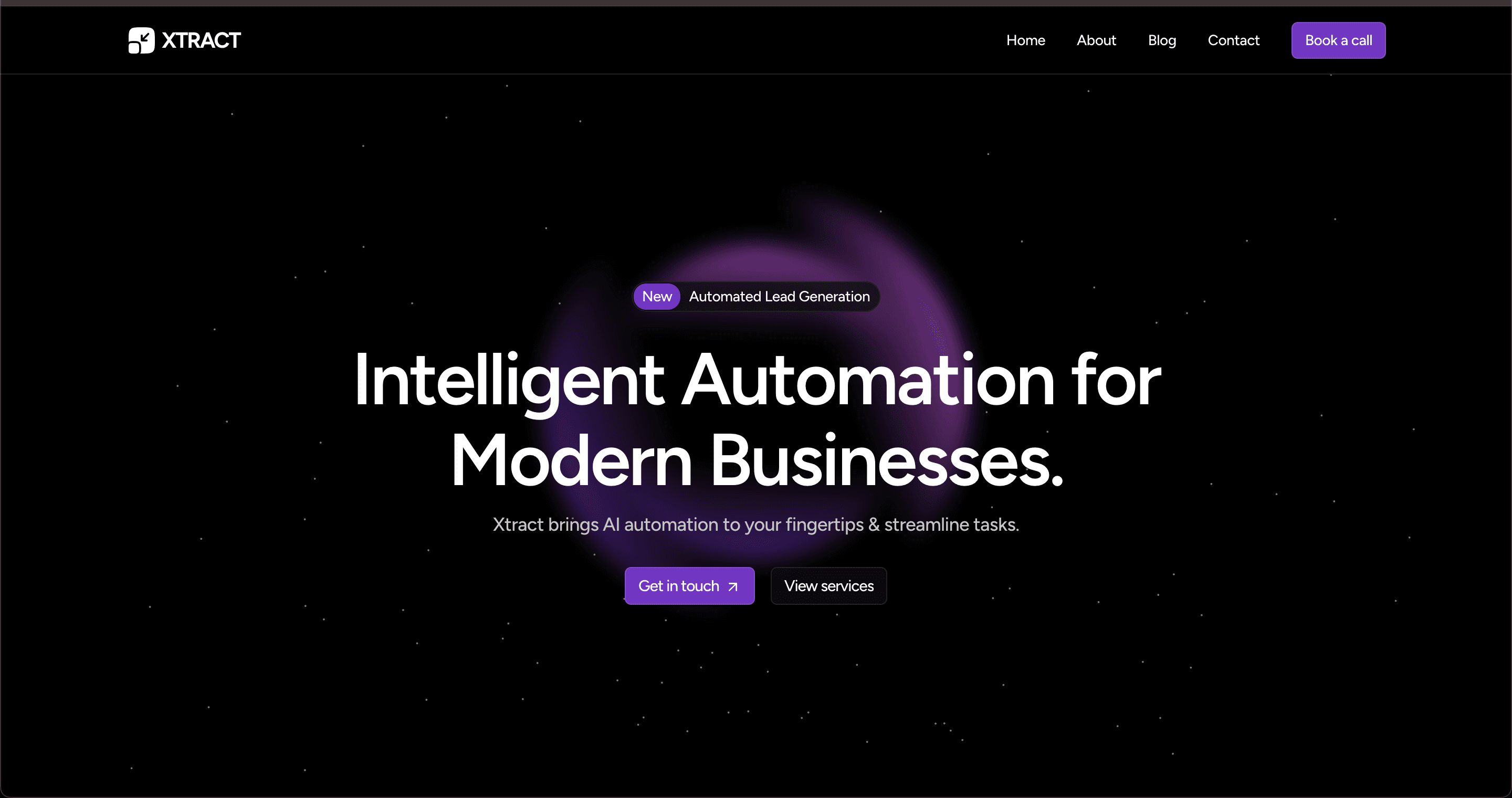 – Hero: Headline “Intelligent Automation for Modern Businesses”, short subheading, and a call-to-action “Get Started” and “See Demo”