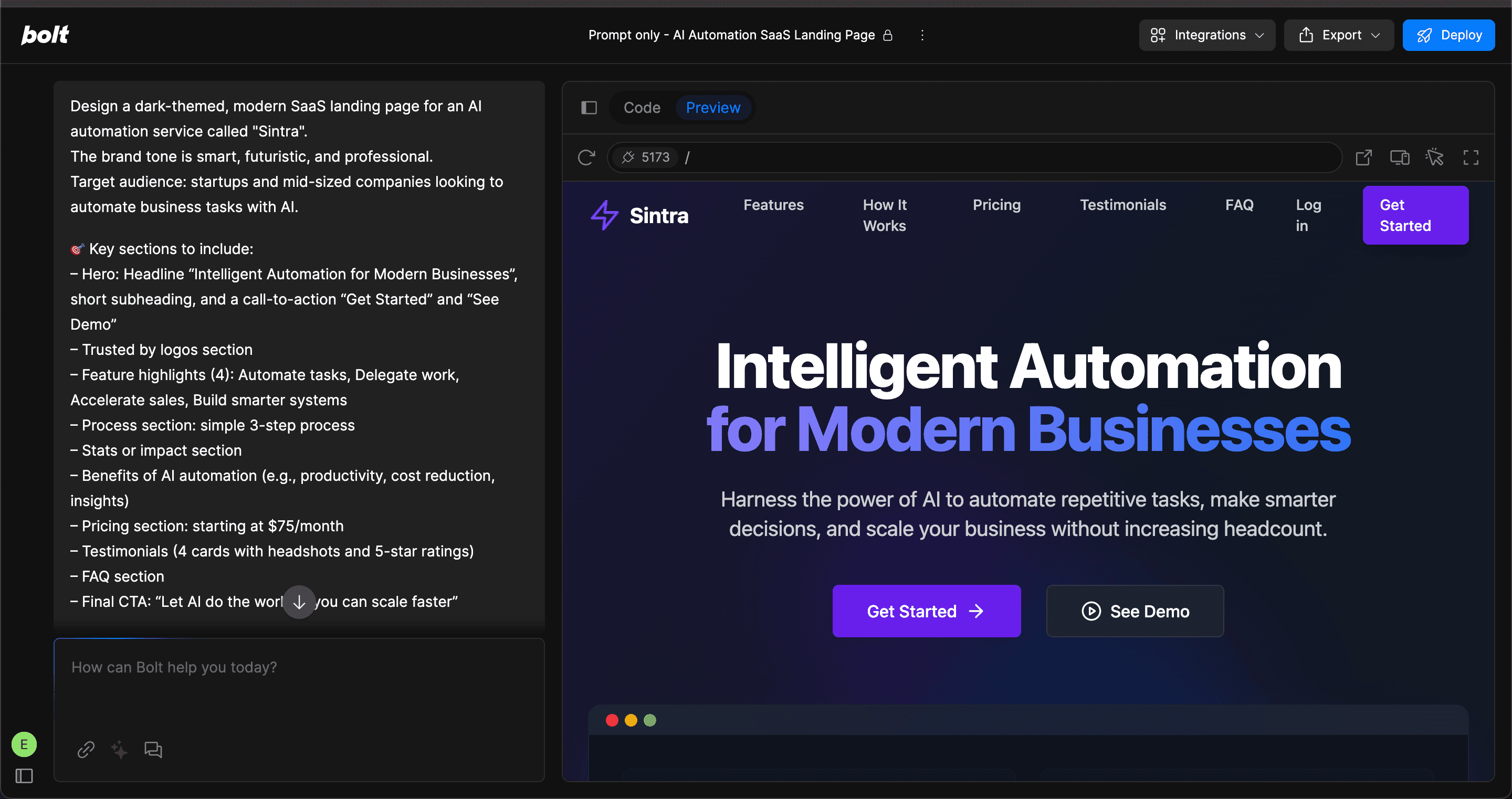Instead of relying on a UI screenshot to guide the result, I decided to focus on feeding Bolt a strong, structured prompt and see how close it could get to a real, usable landing page.