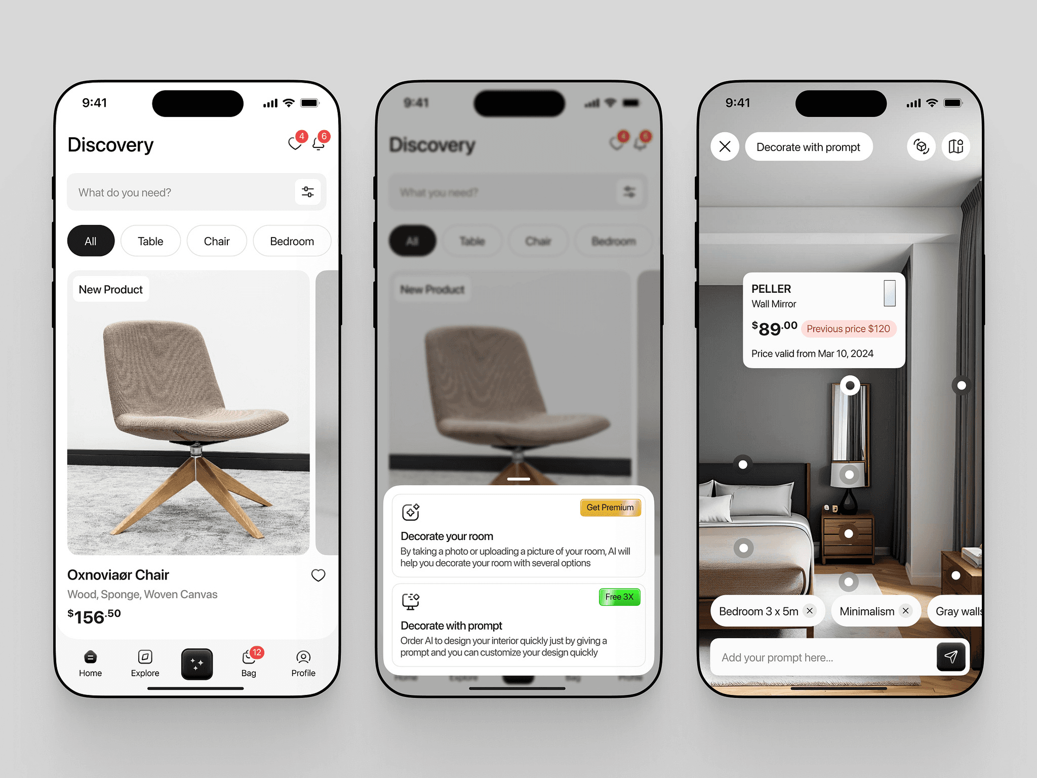 A mobile app for discovering and shopping home furniture. Includes a discovery feed with product cards, filters by category (e.g. Table, Chair, Bedroom), and tappable elements. Product pages show images, materials, and prices. Features AI-powered tools like “Decorate with prompt” and “Decorate your room” with text inputs and tags (e.g. room size, style). Bottom navigation with Home, Explore, Bag, and Profile. Clean layout with modern UI and rounded elements.