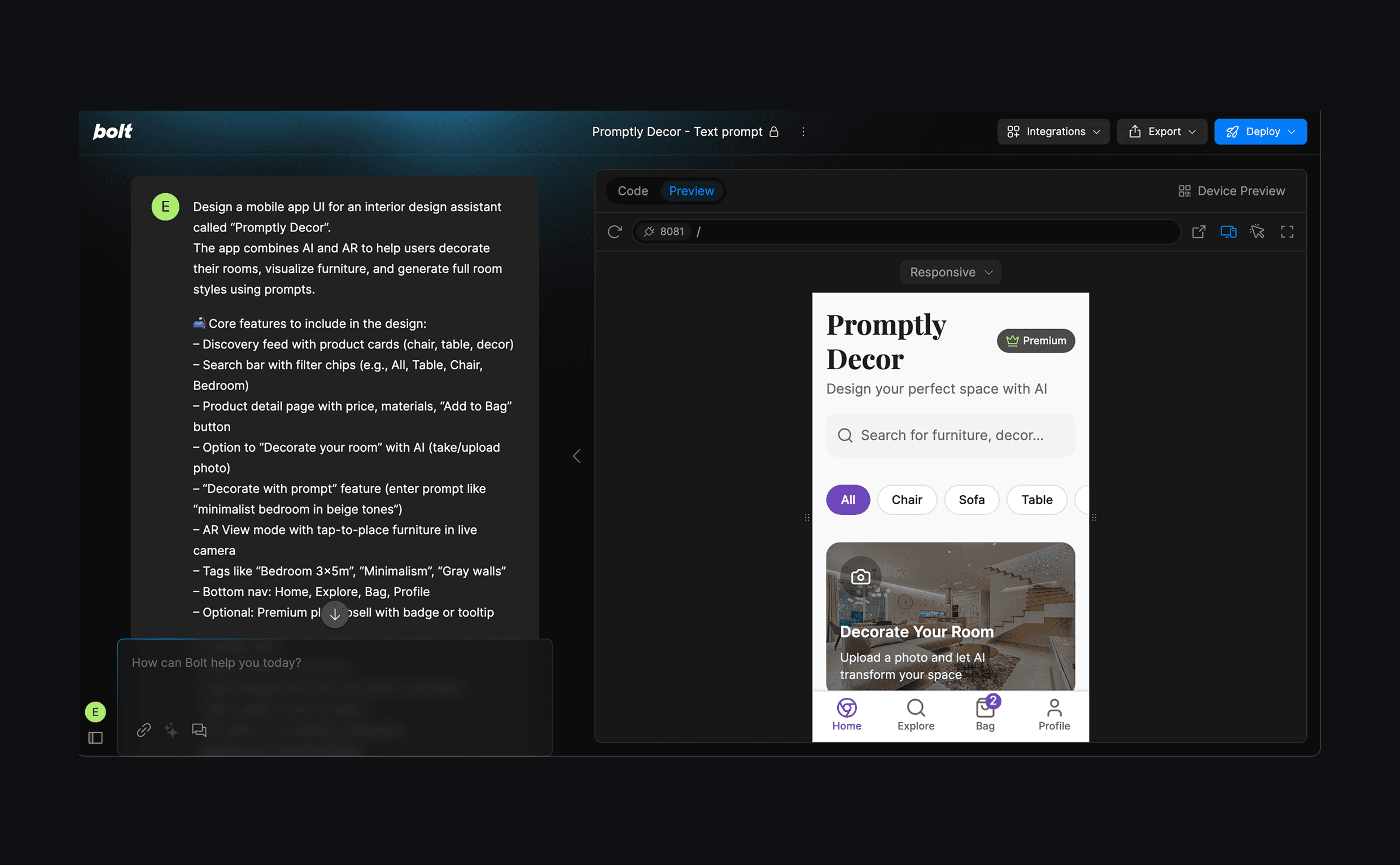 I wanted to explore how far I could push Bolt. New to generate usable mobile prototypes by feeding it a powerful prompt, either from a reference image or text alone.