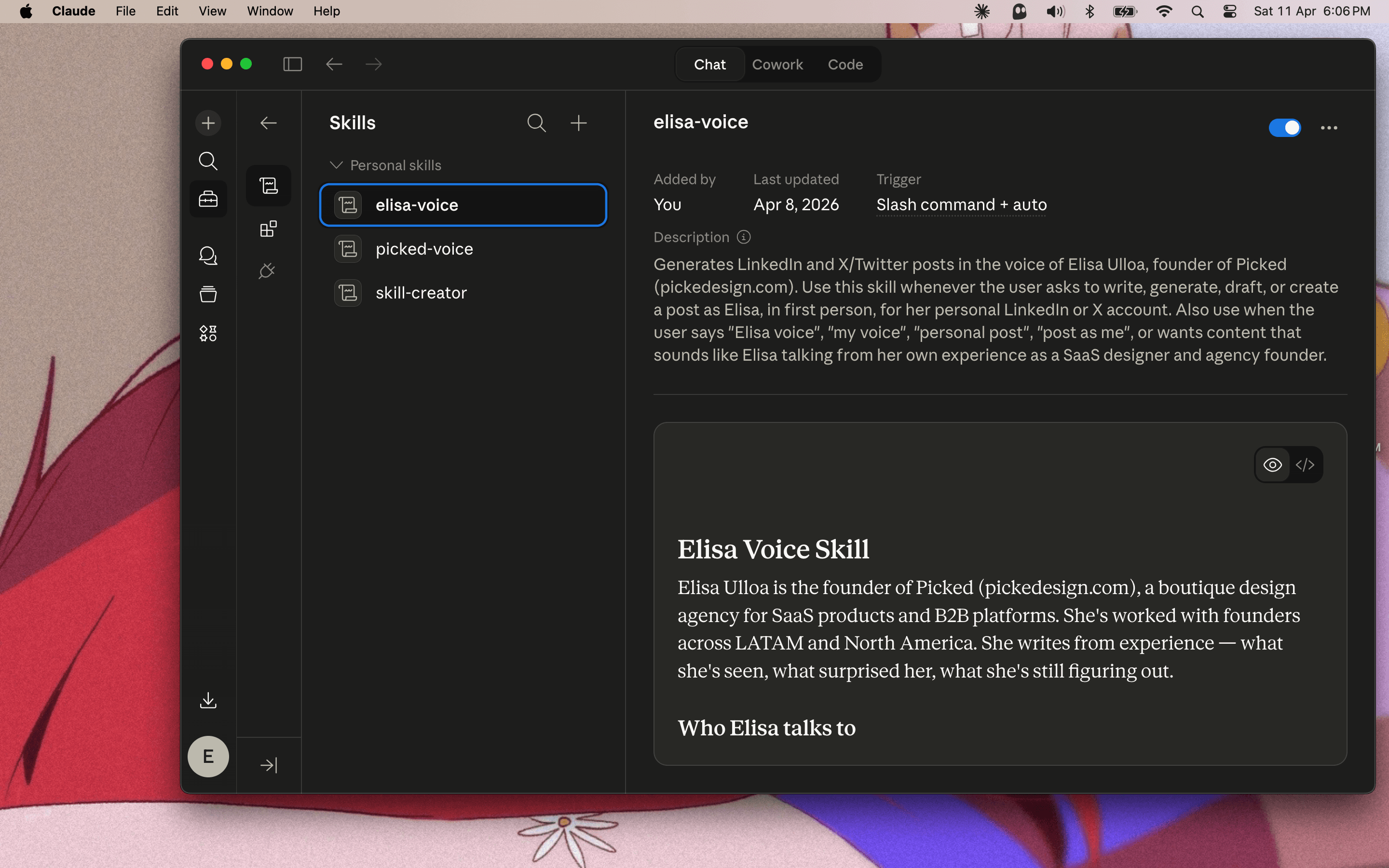 I built each skill as a SKILL.md file — a structured knowledge artifact that Claude loads before generating content. Not just a style guide. A model of how each voice thinks, what it believes, what it avoids, and how it constructs a post from a topic.