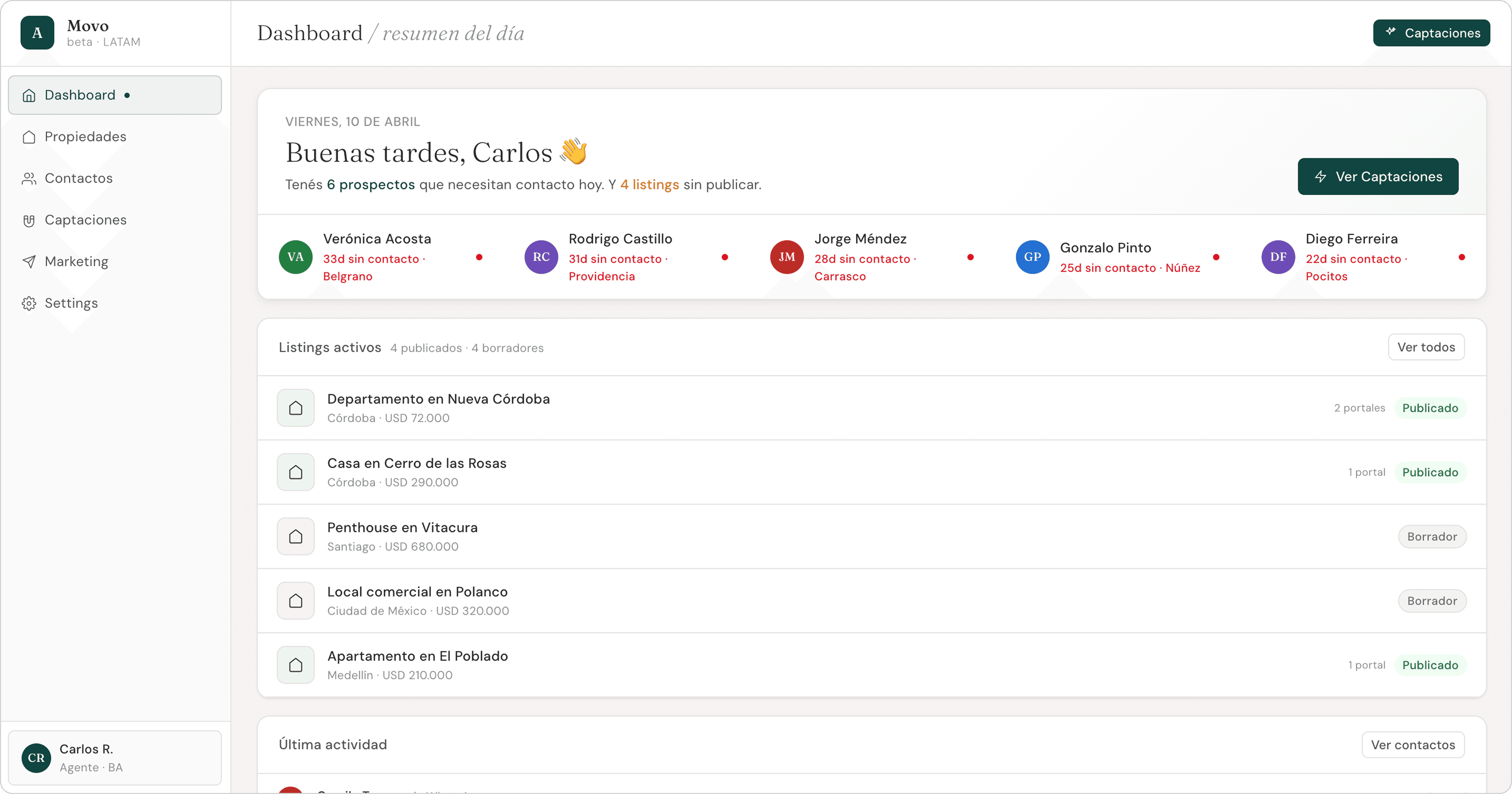 Daily summary: urgency-sorted contact grid, active listings at a glance, recent activity feed.