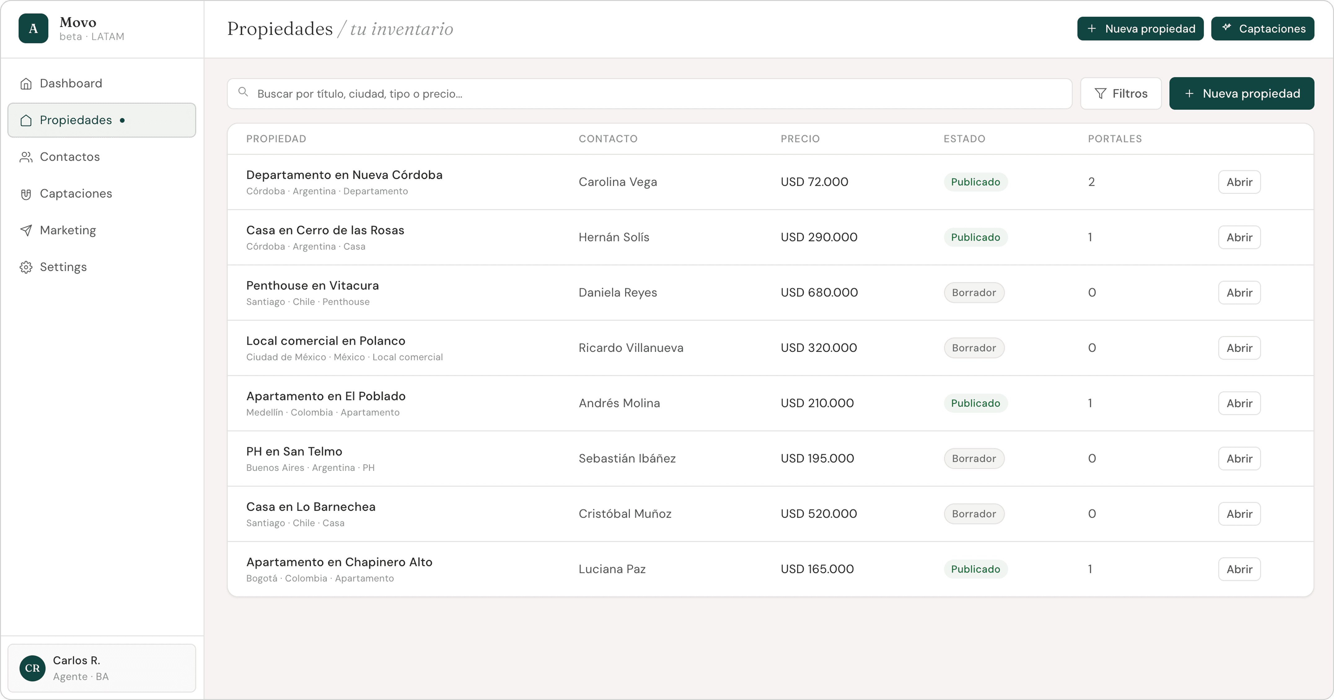 Listing management with publication status, portal sync (ZonaProp, Properati, Inmuebles24), and AI-generated descriptions