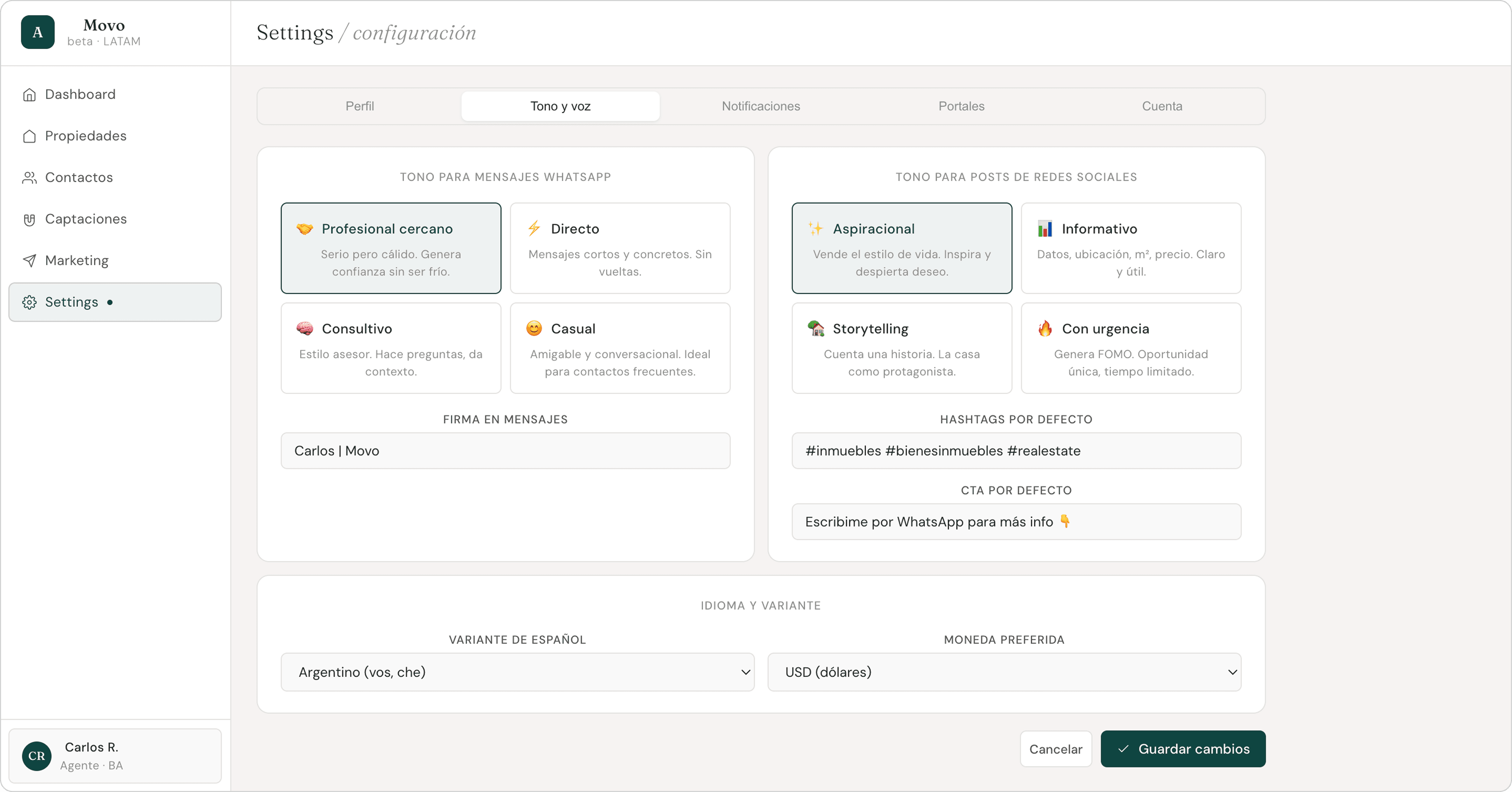 Tone and voice configuration (4 WhatsApp tones × 4 social post tones), portal connections, Spanish variant and currency.