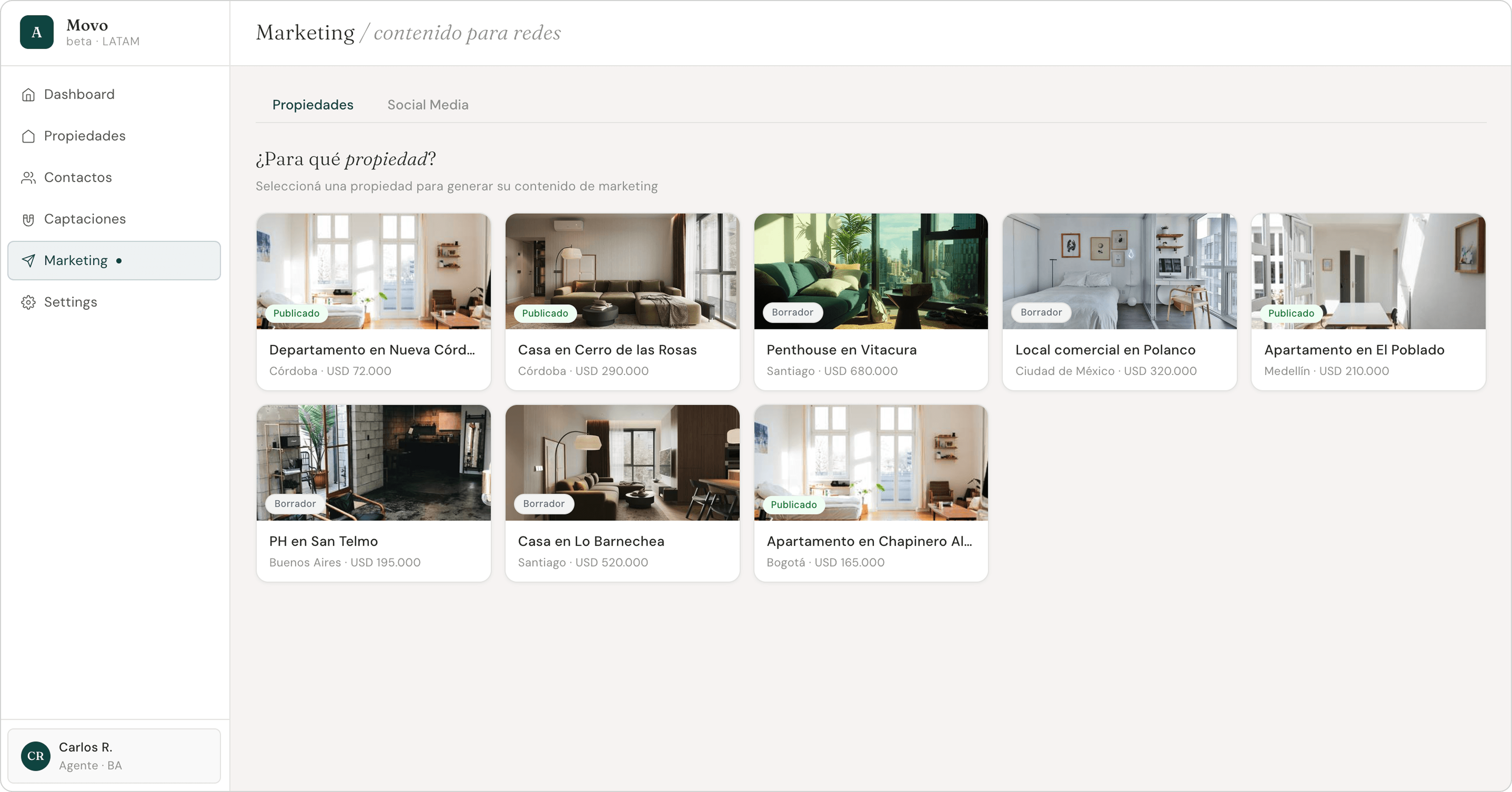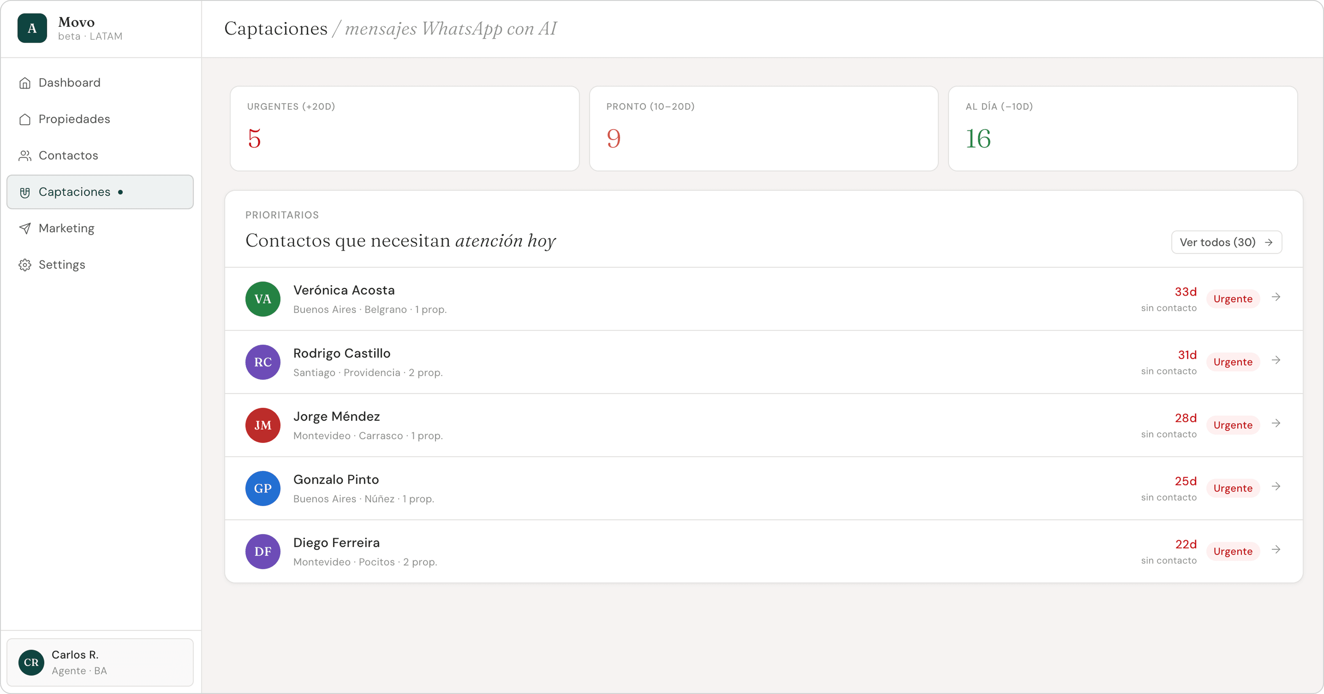 Independent real estate agents in LATAM manage 50+ active contacts — all through WhatsApp, with no system behind them. Follow-ups get dropped. Listings go out late. Social content either gets done manually or doesn't get done at all.