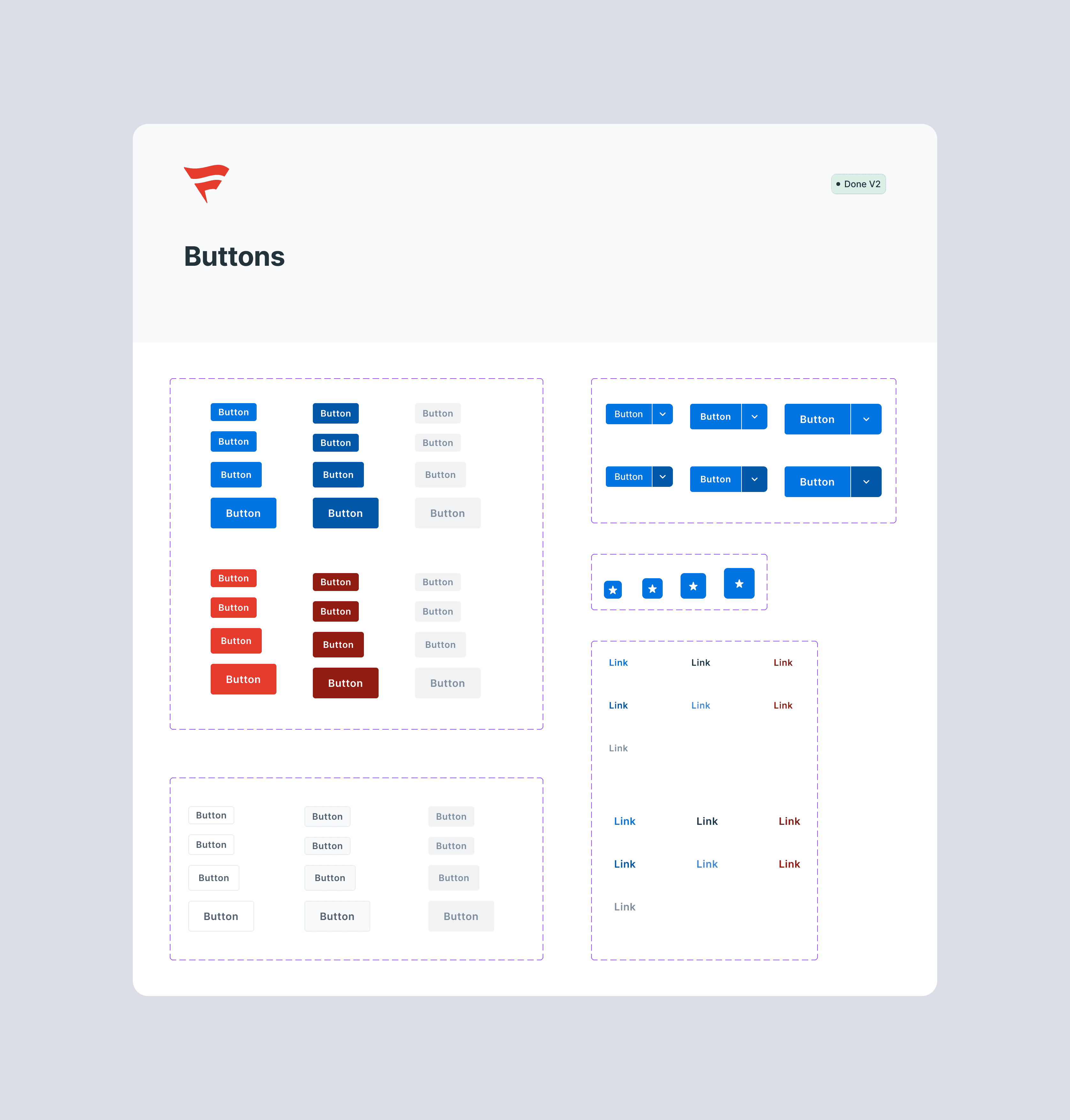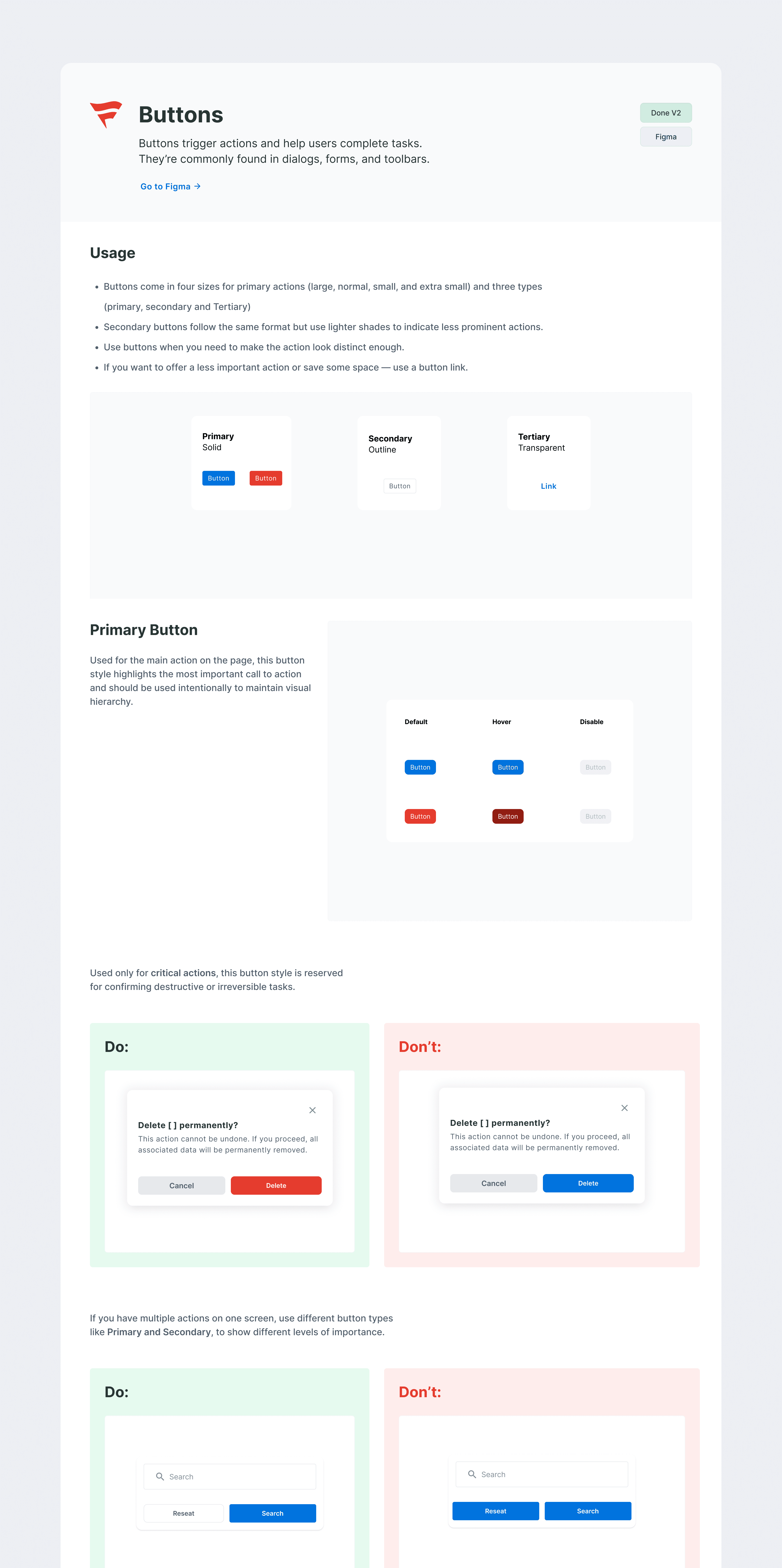 Snapshot of the button docs in Figma—includes states, specs, and usage notes.