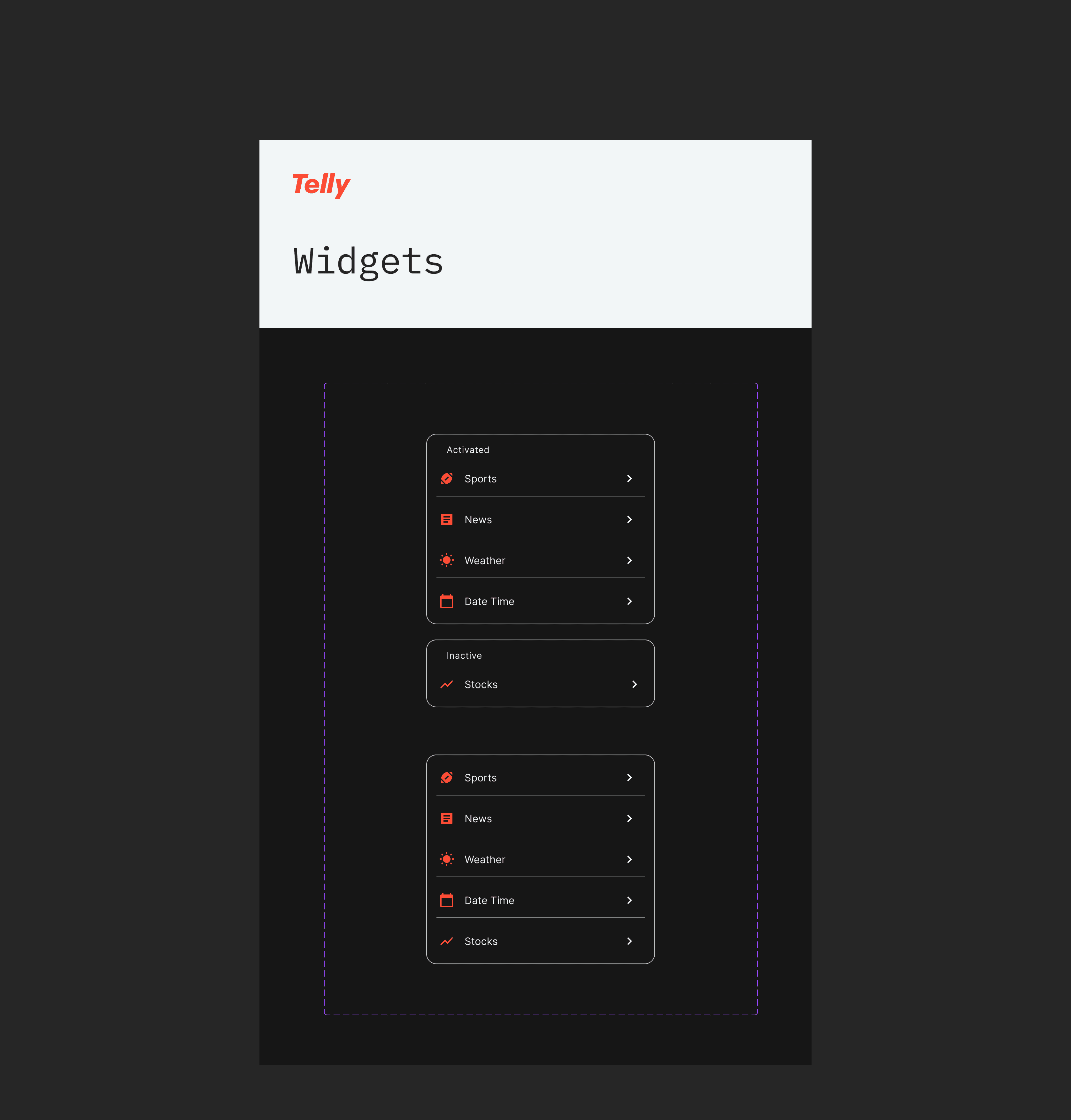 Beyond core features like user registration and waitlisting, we designed the Telly app to offer a more dynamic and personalized experience. Users will soon be able to customize widgets for Weather, Stocks, Sports, and News—directly within the app—turning it into a hub tailored to their interests.